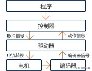 程序控制器(脈沖信號)驅動器(電流轉換)電機編碼器(編碼器信號)驅動器(動作信息)控制器