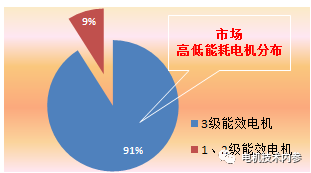 高、低能耗電機在市場上的分布目前,我國中小型三相異步電機仍以3級以下能效電機為主,1、2級電機總數僅占9%左右。對于能效低于2級的電機,未來仍有進一步節能改進的空間,16億元補貼,無疑是高效電機發展的風向標。
