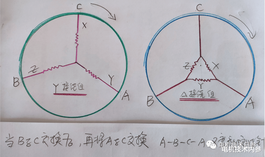 當A相的連接保持不變時,B相和C相的連接互換,自然定子磁場就是A-B-C逆時針旋轉。